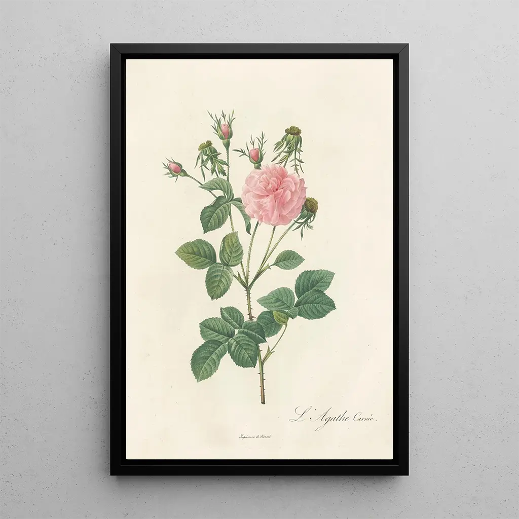 La stampa d'arte di Rosa Gallica Agatha Incarnata ci immerge in un universo di dolcezza e di bellezza naturale. Quest'opera di Pierre Joseph Redouté, celebre per le sue illustrazioni botaniche, si distingue per i suoi colori pastello delicati e i dettagli minuziosamente curati. I petali della rosa, di un rosa tenero, sembrano quasi palpabili, mentre le sfumature di verde delle foglie portano un'armonia rilassante. La tecnica dell'acquerello, padroneggiata da Redouté, conferisce a questa tela un'atmosfera leggera e ariosa, invitando lo spettatore a meravigliarsi davanti alla magnificenza della natura.