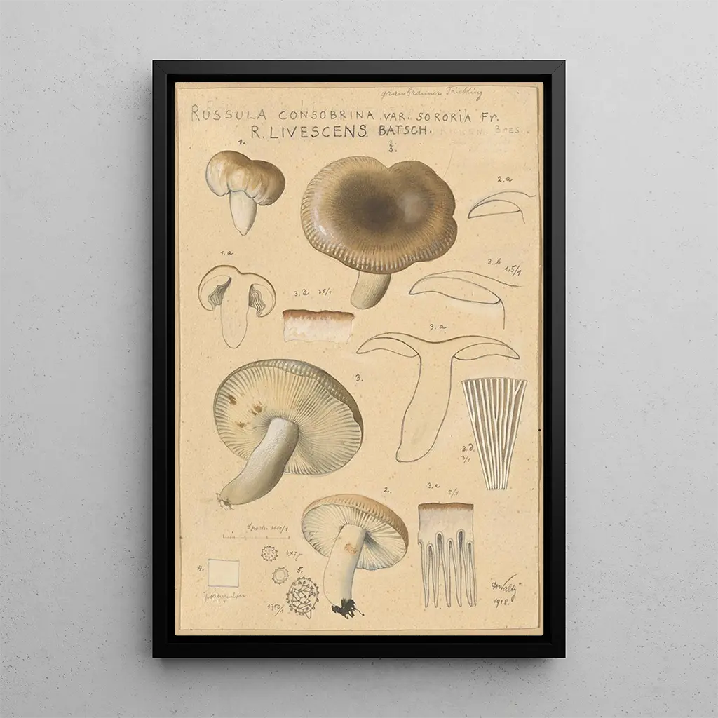 La stampa d'arte di Russula consobrina var sororia, opera di Hans Baldung, evoca una natura vibrante e rigogliosa. Le tonalità terrose e le sfumature delicate di questo fungo, accuratamente dettagliate, rivelano la bellezza cruda della flora selvatica. La tecnica di Baldung, che combina realismo e un tocco di immaginazione, crea un'atmosfera affascinante, quasi magica. Ogni elemento della composizione sembra raccontare una storia, invitando lo spettatore a esplorare i misteri della natura.