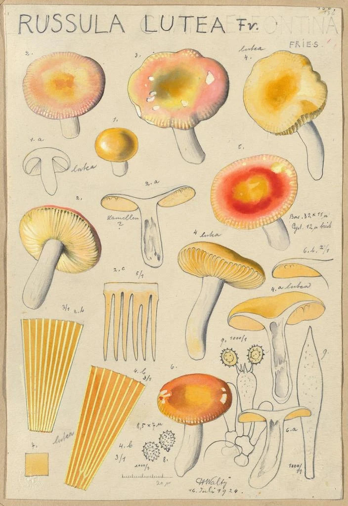 In questa affascinante opera, Hans Baldung ci invita a esplorare l'universo affascinante dei funghi attraverso la sua rappresentazione della Russula lutea. Le tonalità vivaci di giallo e arancione, associate a sfumature di verde, creano un'atmosfera allo stesso tempo vivace e misteriosa. La tecnica di Baldung, che mescola realismo e stilizzazione, dà vita a questo fungo, collocandolo al centro di una composizione che evoca la ricchezza della natura. Ogni dettaglio, dai contorni delicati alle ombre sottili, testimonia l'abilità dell'artista nel catturare l'essenza del soggetto, invitando allo stesso tempo lo spettatore a una contemplazione profonda.