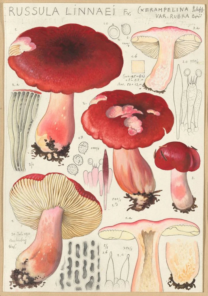 La tela di Hans Baldung rappresentante la Russula linnaei è una vera ode alla biodiversità. Con i suoi colori vivaci e le sue forme delicate, quest'opera cattura l'essenza stessa di questo fungo, spesso poco conosciuto. La composizione è accuratamente equilibrata, mettendo in risalto i dettagli sottili della Russula, creando al contempo un'atmosfera vivace e dinamica. I giochi di luce e ombra, tipici dello stile di Baldung, aggiungono profondità all'opera, invitando lo spettatore a immergersi in un mondo in cui la natura regna sovrana.