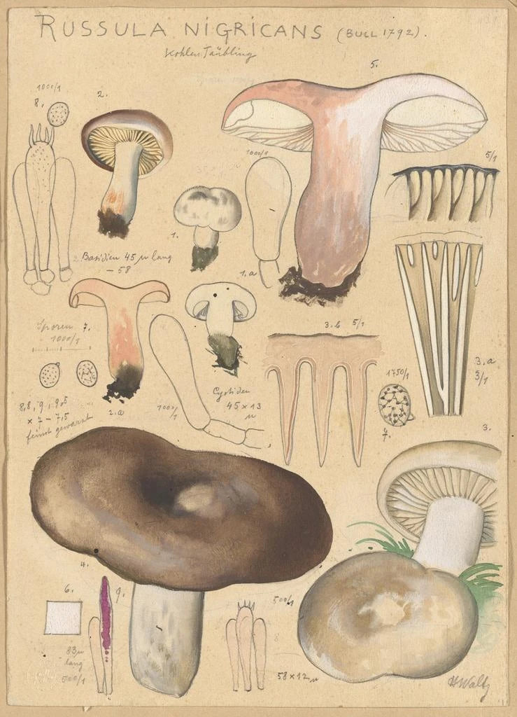 In questa opera affascinante, Hans Baldung ci immerge in un universo in cui la natura si svela sotto una luce enigmatica. La composizione della tela, incentrata sulla Russula nigricans, mette in evidenza tonalità scure e terrose, evocando un'atmosfera allo stesso tempo intrigante e rasserenante. I dettagli minuziosi dei funghi, con le loro forme organiche e le sfumature sottili, creano un'atmosfera quasi magica. La tecnica di Baldung, mescolando realismo ed elementi simbolici, invita lo spettatore a esplorare i misteri della foresta, celebrando al contempo la bellezza effimera della vita.