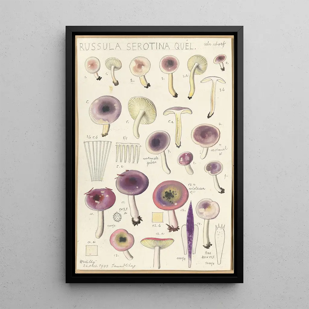 Russula serotina Russula myrtilla : un hommage à la biodiversité La stampa d'arte di Russula serotina Russula myrtilla ci offre una visione affascinante della biodiversità forestale. I ricchi e vari colori dei funghi, che vanno dal viola profondo al verde tenero, evocano una tavolozza naturale di grande bellezza. La maestria di Hans Baldung si manifesta attraverso dettagli minuziosi che catturano l'essenza stessa di queste specie fungine. L'atmosfera che emana da quest'opera è allo stesso tempo rilassante e intrigante, invitando a un'esplorazione dei misteri della natura. Hans Baldung : un artista dalle molteplici sfaccettature Hans Baldung, figura di spicco del Rinascimento, ha saputo distinguersi per il suo approccio innovativo e la capacità di fondere diversi stili artistici. Formato presso Albrecht Dürer, ha sviluppato un linguaggio visivo ricco, oscillando tra il misticismo e la celebrazione della natura. Le sue opere, spesso popolate di simboli, riflettono le preoccupazioni della sua epoca, evidenziando al contempo la bellezza del mondo naturale. La rappresentazione di Russula serotina Russula myrtilla testimonia il suo talento nel immortalare momenti fugaci della vita selvatica. Una riproduzione decorativa con molteplici vantaggi La stampa d'arte di Russula serotina Russula myrtilla è una scelta decorativa che saprà abbellire il vostro interno, sia in un soggiorno, uno studio o una camera da letto. La qualità di stampa garantisce una fedeltà eccezionale ai colori e ai dettagli dell'opera originale, portando un tocco di eleganza e natura nel vostro spazio. Integrando questa tela nella vostra decorazione, create un'atmosfera calda e accogliente, celebrando al contempo la bellezza della biodiversità. Questo quadro diventa così un punto focale, suscitando ammirazione e curiosità in tutti coloro che lo contemplano.