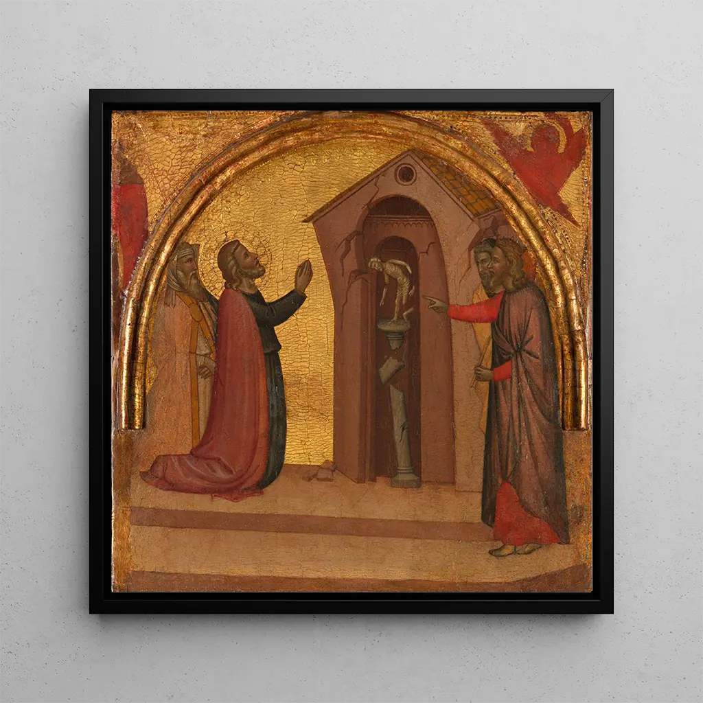 La composizione di San Giovanni Evangelista che fa crollare un tempio pagano cattura un momento di azione spirituale in cui la figura centrale, tesa ed espressiva, domina un paesaggio architettonico in rovina. I colori, fedelmente riprodotti in questa stampa d'arte di San Giovanni Evangelista che fa crollare un tempio pagano, offrono ocra caldi, blu profondi e tocchi d'oro che sottolineano la gravità del miracolo. La tecnica dell'atelier gotico si percepisce nel tratto preciso dei panneggi e nella stilizzazione dei volti, creando un'atmosfera sacra e narrativa che interpella lo sguardo e invita alla contemplazione.