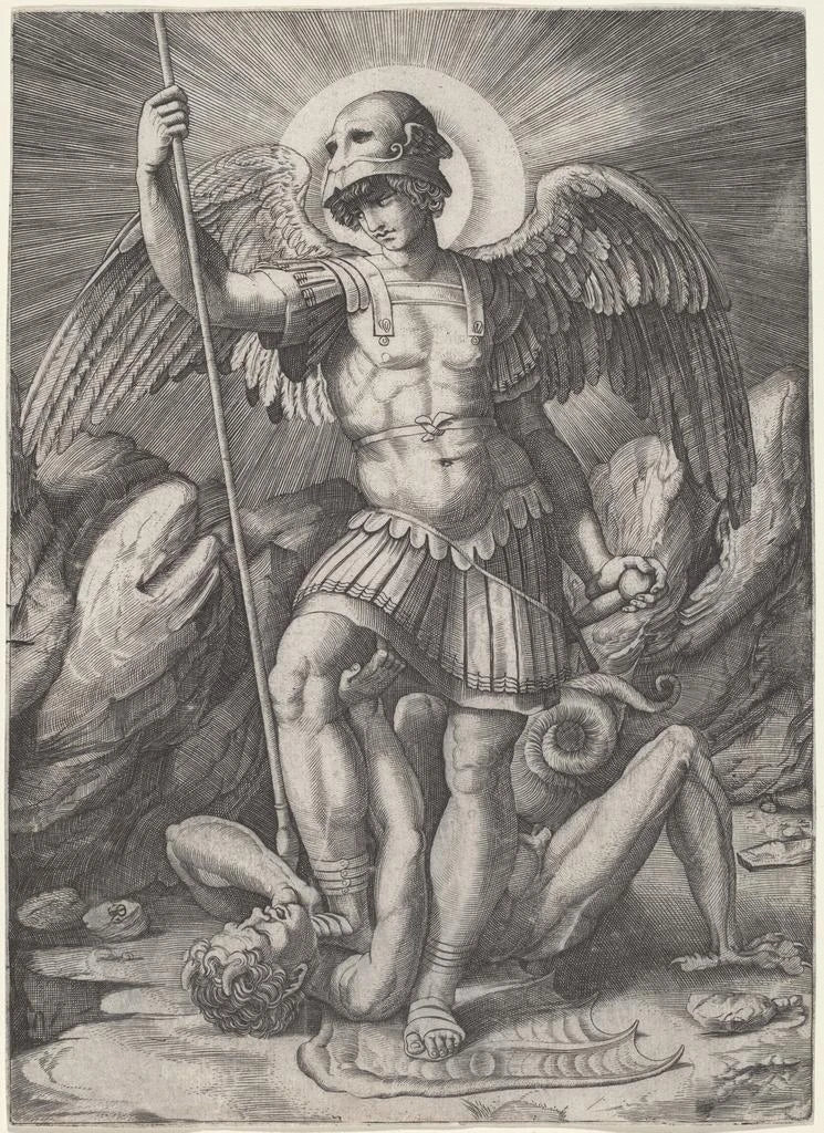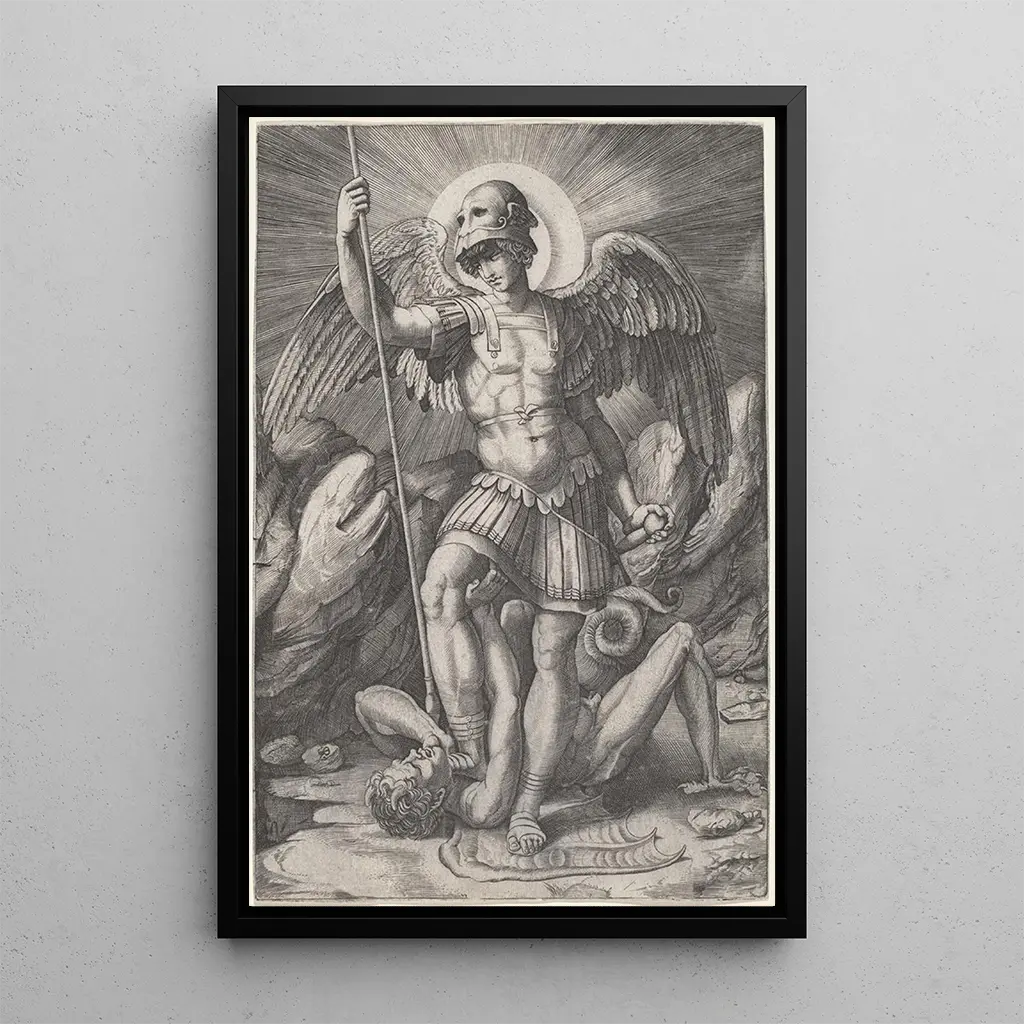 Dans cette œuvre saisissante, Marco Dente représente Saint Michel, l'archange guerrier, dans une posture dynamique et imposante. La composition est marquée par des couleurs vives et des contrastes puissants, mettant en valeur la force de ce personnage céleste. La technique de gravure utilisée par Dente permet de capturer les détails minutieux de l'armure et des ailes déployées de l'archange. L'atmosphère qui se dégage de cette toile est à la fois héroïque et spirituelle, invitant le spectateur à réfléchir sur le combat entre le bien et le mal. Cette stampa d'arte del quadro è una vera ode al coraggio e alla fede.