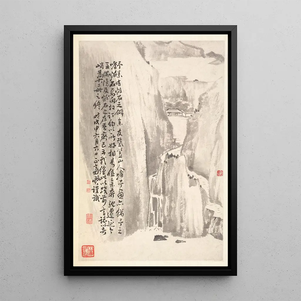 "Falaises abruptes" di Min Zhen ci trasporta nel cuore di un paesaggio grandioso, dove le formazioni rocciose si ergono fieramente contro un cielo drammatico. I colori terrosi e le ombre accentuate creano un’atmosfera allo stesso tempo potente e contemplativa. La tecnica dell’artista, che combina abilmente inchiostro e pittura ad acquerello, permette di rendere la ruvidità delle scogliere e la dolcezza del cielo in un’unica stampa d'arte. Ogni dettaglio, dalle creste alle valli, è accuratamente elaborato, invitando lo spettatore a esplorare la bellezza selvaggia della natura.