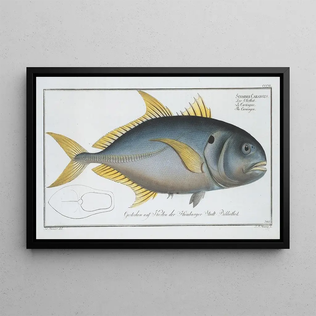 Scomber carangus, il carango: un'ode al mare e ai suoi abitanti La stampa d'arte Scomber carangus, il carango, di Marcus Elieser Bloch, rivela una rappresentazione affascinante di questo pesce emblematico. Le sfumature di blu e d'argento, abbinate a tocchi di giallo, evocano la luce scintillante dell'oceano. La tecnica della incisione, eseguita con cura, permette di catturare i dettagli delicati delle scaglie e delle pinne, trasmettendo al contempo un'atmosfera di calma e serenità. L'opera invita lo spettatore a immergersi nel mondo marino, a esplorare le profondità e ad apprezzare la bellezza delle creature che lo abitano. Marcus Elieser Bloch: un pioniere dell'ichthyologia artistica Marcus Elieser Bloch, naturalista e artista del XVIII secolo, è riconosciuto per i suoi contributi allo studio dei pesci. Originario della Germania, ha dedicato la sua vita alla documentazione delle specie marine, unendo scienza e arte. La sua opera principale, "Ichthyologie", ha segnato un passo importante nell'illustrazione scientifica, influenzando numerosi artisti e scienziati. Bloch è riuscito a catturare non solo la forma dei pesci, ma anche la loro essenza, rendendo omaggio alla diversità della vita acquatica. La sua passione per la natura e la cura dei dettagli lo rendono una figura imprescindibile dell'arte naturalistica. Una scelta decorativa con molteplici vantaggi La stampa d'arte Scomber carangus, il carango, rappresenta una scelta decorativa ideale per diversi spazi, che sia nel soggiorno, in uno studio o in una camera da letto. La qualità di stampa e la fedeltà all'opera originale garantiscono un risultato estetico notevole. Questo quadro cattura lo sguardo e stimola la curiosità, portando un tocco di freschezza marina nel vostro ambiente. Integrando questa tela nella vostra decorazione, create un'atmosfera rilassante, celebrando la bellezza della natura e delle sue meraviglie acquatiche.