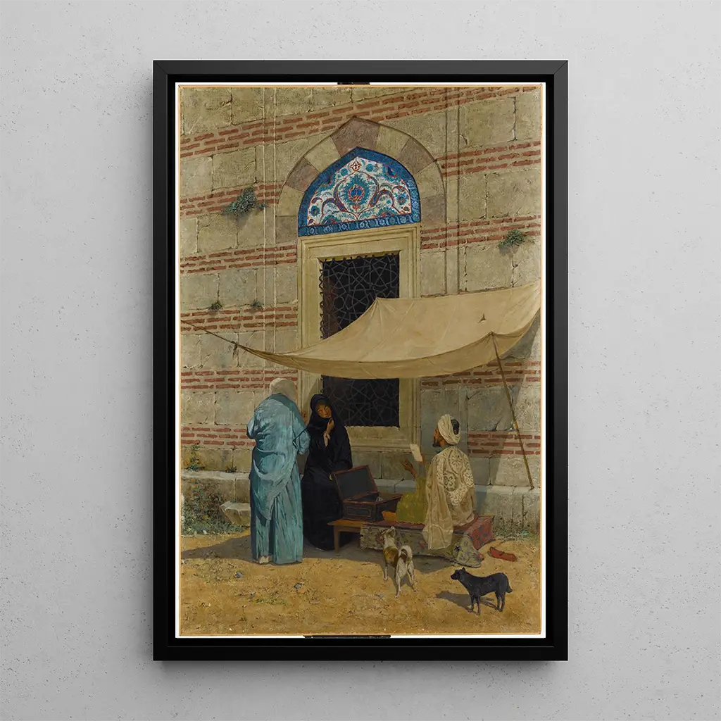 Scribe public : un ritratto della saggezza e della tradizione In "Scribe public", Osman Hamdi Bey cattura l'essenza di un momento intriso di serenità e concentrazione. La composizione mette in evidenza un uomo, seduto, immerso nella scrittura, circondato da libri e rotoli, simboli di sapere e cultura. I colori caldi e terrosi, tipici dell'arte ottomana, creano un'atmosfera rilassante e contemplativa. La luce soffusa che illumina il volto dello scriba accentua la sua espressione riflessiva, invitando lo spettatore a interrogarsi sul contenuto dei suoi pensieri. Quest'opera, allo stesso tempo intima e universale, evoca la ricchezza della tradizione letteraria e intellettuale del mondo islamico. Osman Hamdi Bey : il ponte tra l'Oriente e l'Occidente Osman Hamdi Bey, nato nel 1842, è una figura emblematica dell'arte ottomana moderna. In qualità di pittore, archeologo e intellettuale, svolge un ruolo cruciale nella ridefinizione dell'arte turca alla fine del XIX secolo. Influenzato dai movimenti europei, riesce a unire tradizione e modernità, creando opere che riflettono la ricchezza della cultura ottomana integrando anche elementi occidentali. "Scribe public" si inserisce in questa prospettiva, illustrando la vita quotidiana e i valori intellettuali della sua epoca. Hamdi Bey è riconosciuto per la sua capacità di catturare momenti della vita ottomana, presentandoli con una finezza artistica propria. Una riproduzione decorativa con molteplici vantaggi La riproduzione di "Scribe public" costituisce un'aggiunta elegante a qualsiasi ambiente, che sia un salotto, uno studio o una camera da letto. La qualità della riproduzione garantisce una fedeltà notevole ai dettagli dell'opera originale, permettendo di apprezzare appieno la bellezza di questa tela. L'attrattiva estetica di quest'opera risiede nella sua capacità di suscitare riflessione e di arricchire lo spazio abitativo. Integrando questa riproduzione nel vostro arredamento, non portate solo un pezzo d'arte, ma anche un invito a esplorare la storia e la cultura, creando un'atmosfera calda e ispiratrice.
