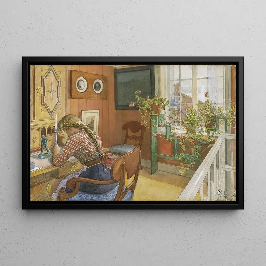 Scrittura di lettere : una scena intima della vita quotidiana In questa delicata opera, Carl Larsson cattura un momento di tenerezza e riflessione. La composizione mette in evidenza una donna, probabilmente una madre, che scrive lettere, circondata da un interno caldo e luminoso. I colori tenui e pastello, tipici dell’artista, creano un’atmosfera pacifica e intima. La luce naturale che entra dalla finestra evidenzia i dettagli minuziosi dei mobili e degli oggetti, invitando lo spettatore a immergersi in questa scena di vita. Ogni elemento sembra raccontare una storia, e si percepisce quasi il profumo della carta e dell’inchiostro. Carl Larsson : un maestro del movimento Arts & Crafts Carl Larsson, pittore svedese del XIX secolo, è riconosciuto per il suo ruolo principale nel movimento Arts & Crafts. Influenzato dal prerafaelismo e dal folklore scandinavo, ha saputo unire tradizione e modernità nelle sue opere. Larsson ha dedicato gran parte della sua carriera a rappresentare la vita familiare e gli interni svedesi, portando un tocco di poesia in scene ordinarie. Il suo stile, caratterizzato da linee chiare e colori vivaci, ha avuto un impatto duraturo sull’arte scandinava e continua a ispirare molti artisti contemporanei. Una riproduzione decorativa con molteplici vantaggi La stampa d'arte di questa tela, "Scrittura di lettere", è una scelta ideale per abbellire il tuo soggiorno, ufficio o camera da letto. La qualità di stampa garantisce una fedeltà notevole ai dettagli originali, permettendo di apprezzare appieno l’atmosfera calda dell’opera. Integrando questa stampa d'arte nella tua decorazione, porti un tocco di eleganza e serenità nel tuo spazio. Il suo fascino estetico e il messaggio di dolcezza ne fanno un elemento decorativo che saprà conquistare i tuoi ospiti e arricchire il tuo ambiente quotidiano.