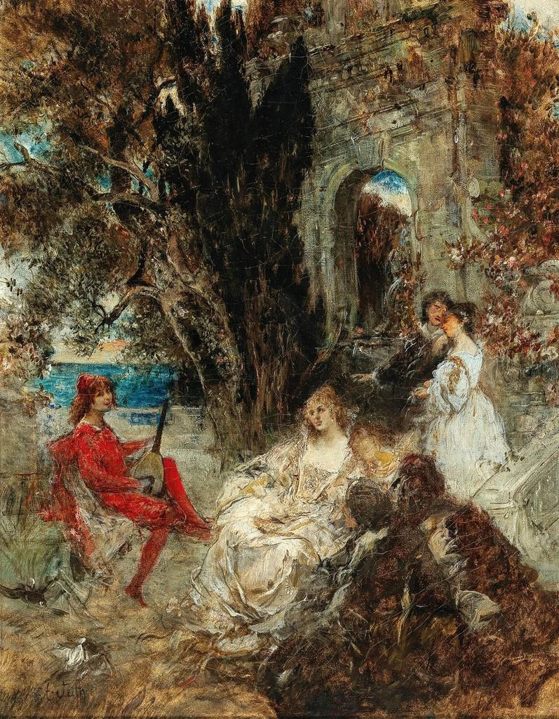 Lo stile di "Sérénade" si caratterizza per un’armonia delicata tra luce e ombra, creando un gioco di contrasti che cattura immediatamente lo sguardo. Eduard Veith, maestro della pittura romantica, utilizza colori caldi e sfumature sottili per dare vita ai suoi personaggi. In questa opera, le figure umane sono rappresentate con tale finezza che sembrano quasi palpabili, come se si potesse sentire il loro respiro. La composizione, accuratamente orchestrata, guida l’occhio attraverso la scena, permettendo un’immersione totale in questo istante sospeso nel tempo. La leggerezza delle pose e la fluidità dei movimenti dei personaggi testimoniano un savoir-faire eccezionale, rendendo questa stampa d'arte unica nel suo genere.
