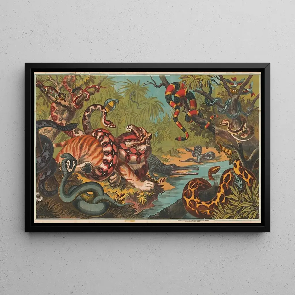 La riproduzione del Serpente della giungla che strangola un animale è un pezzo audace che saprà catturare l'attenzione in qualsiasi spazio. Che si tratti di un soggiorno, di un ufficio o di una camera da letto, questa tela aggiunge un tocco di esotismo e dinamismo alla tua decorazione. La qualità di stampa garantisce una fedeltà notevole all'opera originale, permettendo di apprezzare ogni dettaglio. Integrando questa stampa d'arte nel tuo interno, crei un punto focale che suscita curiosità e ammirazione, celebrando al contempo la bellezza selvaggia della natura. Regalati questa opera per arricchire la tua collezione e trasformare il tuo spazio in un luogo di evasione e meraviglia.