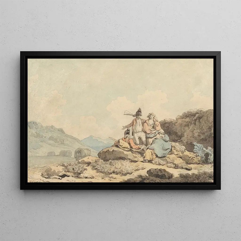 In questa stampa d'arte di Soldati e contadine, Francis Wheatley ci immerge nel cuore di un'epoca in cui la vita quotidiana si mescolava agli eventi storici. La composizione dinamica dell'opera, con i suoi personaggi in movimento, evoca un'atmosfera di cameratismo e fatica. I colori caldi, dominati da tonalità terrose e bagliori di luce, infondono una vita palpabile a questa scena. La tecnica di Wheatley, che unisce il realismo a un tocco di romanticismo, permette di percepire l'emozione dei personaggi, siano essi soldati o contadini, tutti uniti da un destino comune.
