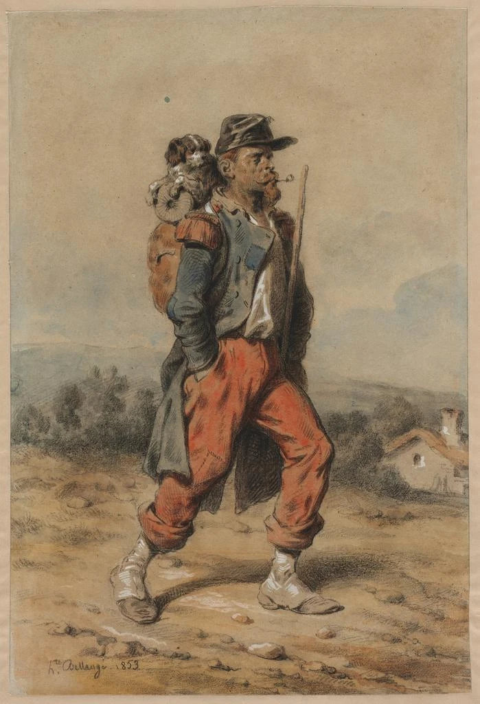 Hippolyte Bellangé, attivo nel XIX secolo, è riconosciuto per le sue opere che illustrano la vita militare con grande precisione. Influenzato dal romanticismo, ha saputo catturare momenti di valore e di eroismo, evidenziando allo stesso tempo la dimensione umana dei suoi soggetti. I suoi quadri, spesso ispirati da eventi storici, testimoniano un'epoca in cui la guerra era onnipresente. Bellangé ha saputo farsi un nome grazie alla sua capacità di immortalare scene di battaglia, ma anche momenti di tenerezza, come questo, in cui la relazione tra l'uomo e l'animale viene messa in luce.