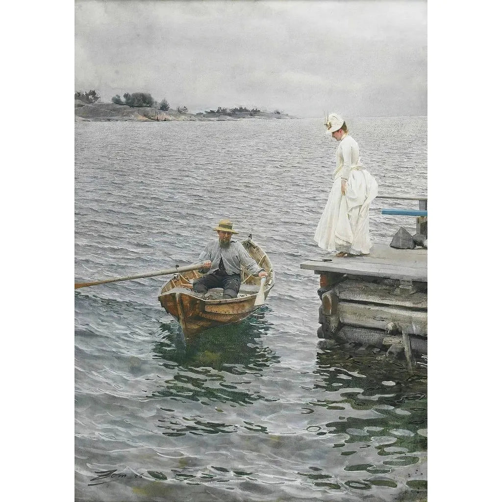"Sommarnje" è un'opera emblematico di Anders Zorn che evoca il calore e la bellezza dell'estate svedese. Attraverso tonalità dorate e sfumature di blu, Zorn dipinge una scena vivace dove la luce del sole danza sull'acqua, creando un gioco di riflessi incantatori. Le figure umane, immerse in questa luce, sembrano sbocciare nella natura circostante, illustrando la gioia semplice dei piaceri estivi. La tecnica di Zorn, mescolando realismo e impressionismo, conferisce a questa tela un'atmosfera al tempo stesso intima e universale, invitando alla nostalgia dei giorni soleggiati.