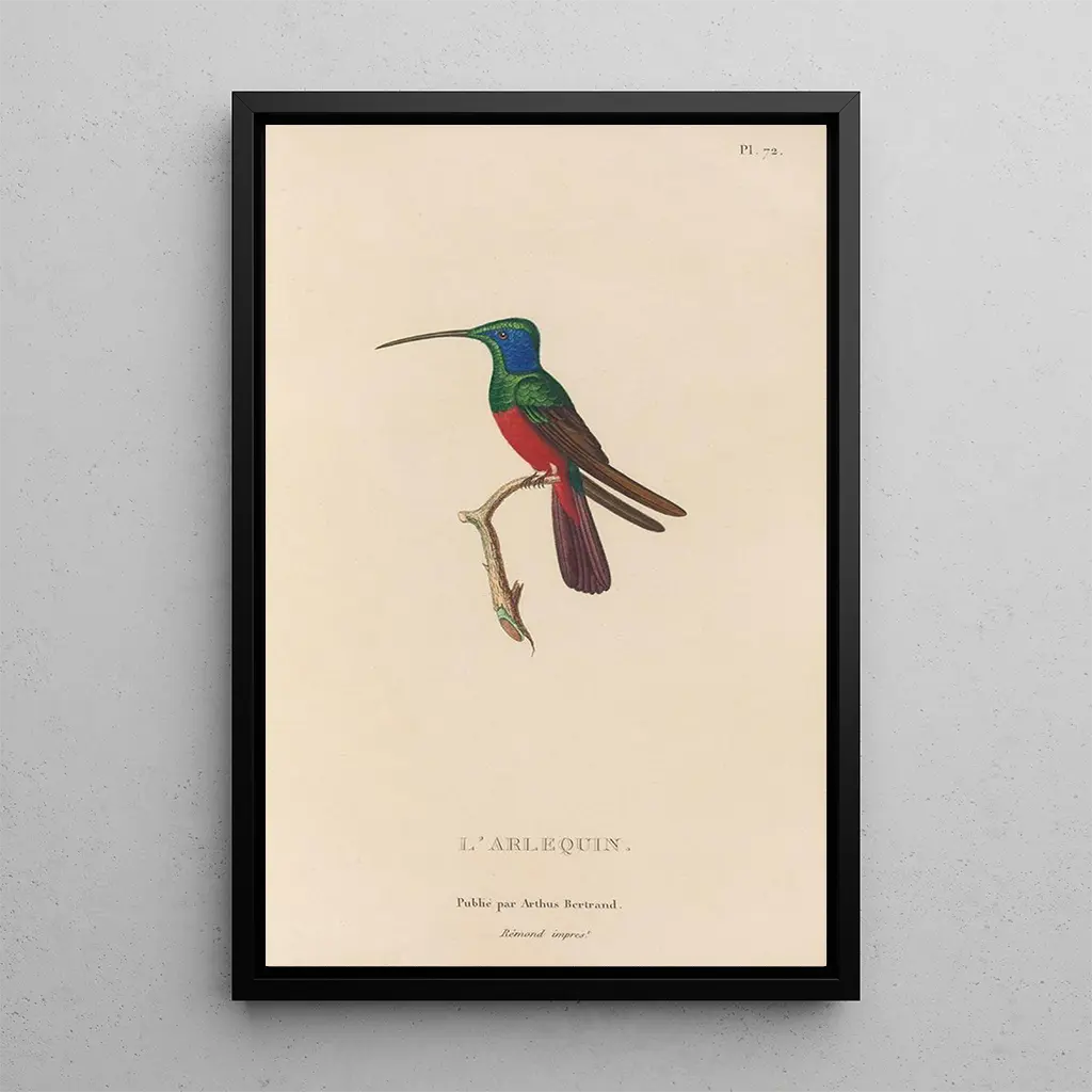 L'opera "Storia naturale delle colibrì Pl73" di René Primevère Lesson ci immerge in un universo vibrante dove la natura si svela con brillantezza. I colori vivaci dei piumaggi dei colibrì, che vanno dal verde smeraldo al blu cobalto, catturano lo sguardo e evocano una sensazione di leggerezza. La tecnica di incisione utilizzata da Lesson permette di rendere ogni dettaglio con una precisione notevole, evidenziando la delicatezza delle piume e l'eleganza delle pose degli uccelli. Questa tela invita a una contemplazione attenta, rivelando la bellezza effimera di queste creature affascinanti, veri gioielli della biodiversità.
