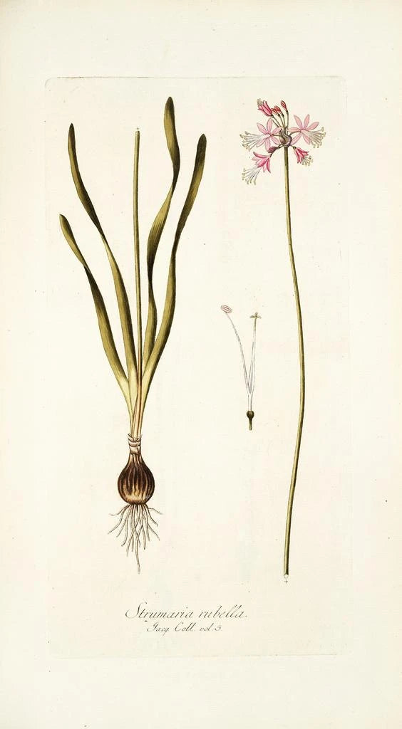 Nikolaus Joseph Freiherr von Jacquin, botanico e artista del XVIII secolo, ha saputo unire scienza e arte nelle sue opere. Nato nel 1727 in Austria, è stato influenzato dai movimenti dell'Illuminismo, dove l'osservazione della natura occupava un ruolo preponderante. I suoi viaggi in Sud America e nei Caraibi gli hanno permesso di scoprire una flora ricca e varia, che ha poi trascritto con precisione nelle sue illustrazioni. Jacquin è riconosciuto per il suo contributo alla botanica, ma anche per il suo stile artistico unico, che combina rigore scientifico e sensibilità estetica. Le sue opere, come Strumaria rubella, testimoniano l'importanza della natura nell'arte del suo tempo.