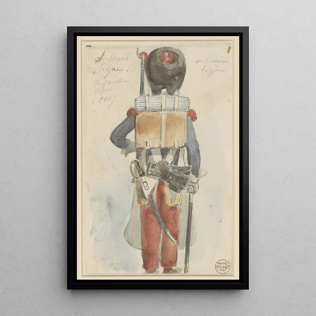 Denis Auguste Marie Raffet, attivo nel XIX secolo, è riconosciuto per il suo talento eccezionale nel campo del disegno e della stampa. Influenzato dal romanticismo, ha saputo catturare lo spirito militare della sua epoca, in particolare attraverso le sue rappresentazioni di battaglie e soldati. Raffet è stato anche un membro attivo dell'École de Barbizon, dove ha sviluppato uno stile unico che combina realismo e idealizzazione. La sua opera "Studio di uniforme" testimonia il suo impegno a immortalare la vita militare, rendendolo una figura emblematica dell'arte francese del XIX secolo.