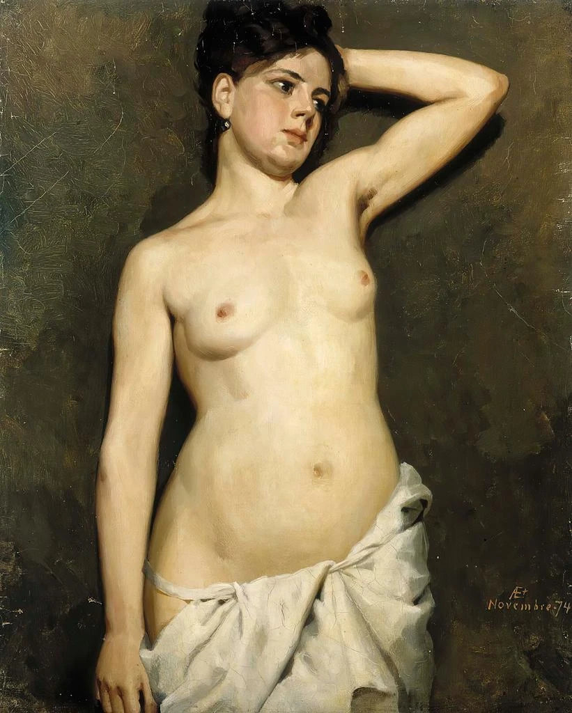L'estetica di Edelfelt si distingue per il suo approccio naturalista, dove la resa delle texture e delle luci svolge un ruolo fondamentale. In "Studio di nudo femminile", l'artista utilizza pennellate delicate per modulare le ombre e le luci sulla pelle del modello, creando così un'atmosfera di dolcezza e intimità. La composizione, allo stesso tempo equilibrata e dinamica, invita a un'esplorazione visiva delle forme, dove ogni curva è valorizzata con una sensibilità notevole. Le tonalità scelte, calde e avvolgenti, evocano una sensualità palpabile, mantenendo un'eleganza raffinata. Con questa opera, Edelfelt non si limita a rappresentare un corpo, ma racconta una storia, quella di un incontro tra arte e vita, tra lo sguardo e l'emozione.