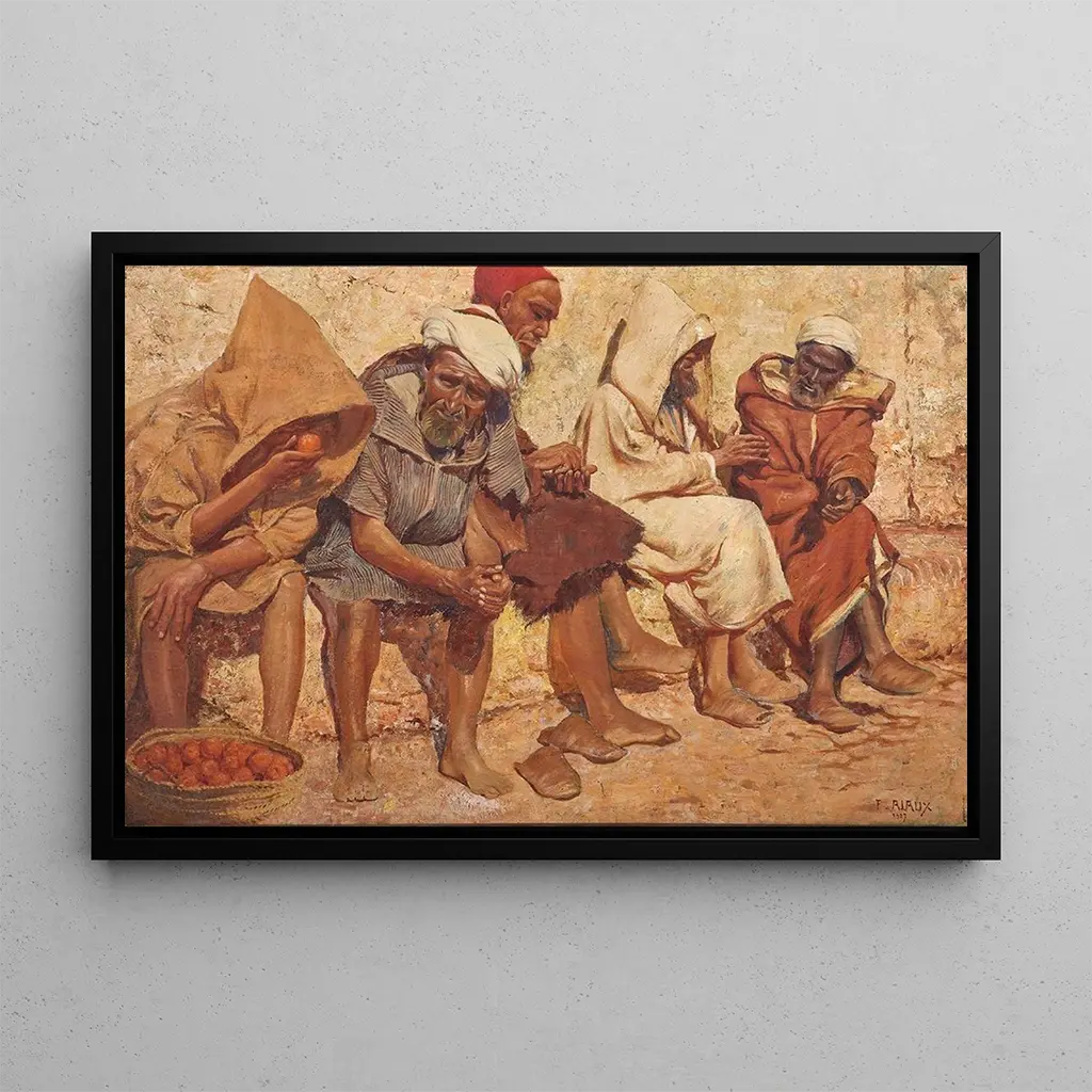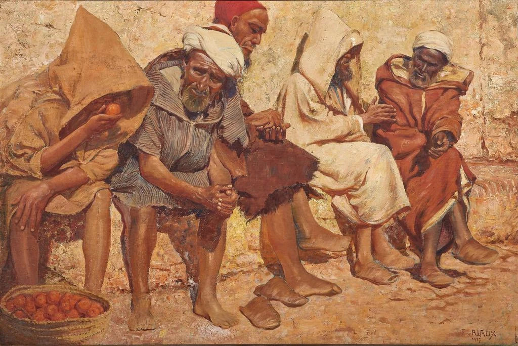 In Sul banco, Tanger, François Alaux cattura un istante di vita semplice e autentica. La tela rappresenta una scena soleggiata in cui alcuni personaggi si riposano, circondati dall'architettura tipica di Tanger. I colori caldi e luminosi evocano il calore del clima mediterraneo, mentre le ombre delicate aggiungono profondità alla composizione. Alaux riesce a trasmettere un'atmosfera di tranquillità e convivialità, invitando lo spettatore a immaginarsi in questo luogo idilliaco, a condividere un momento di calma e contemplazione.
