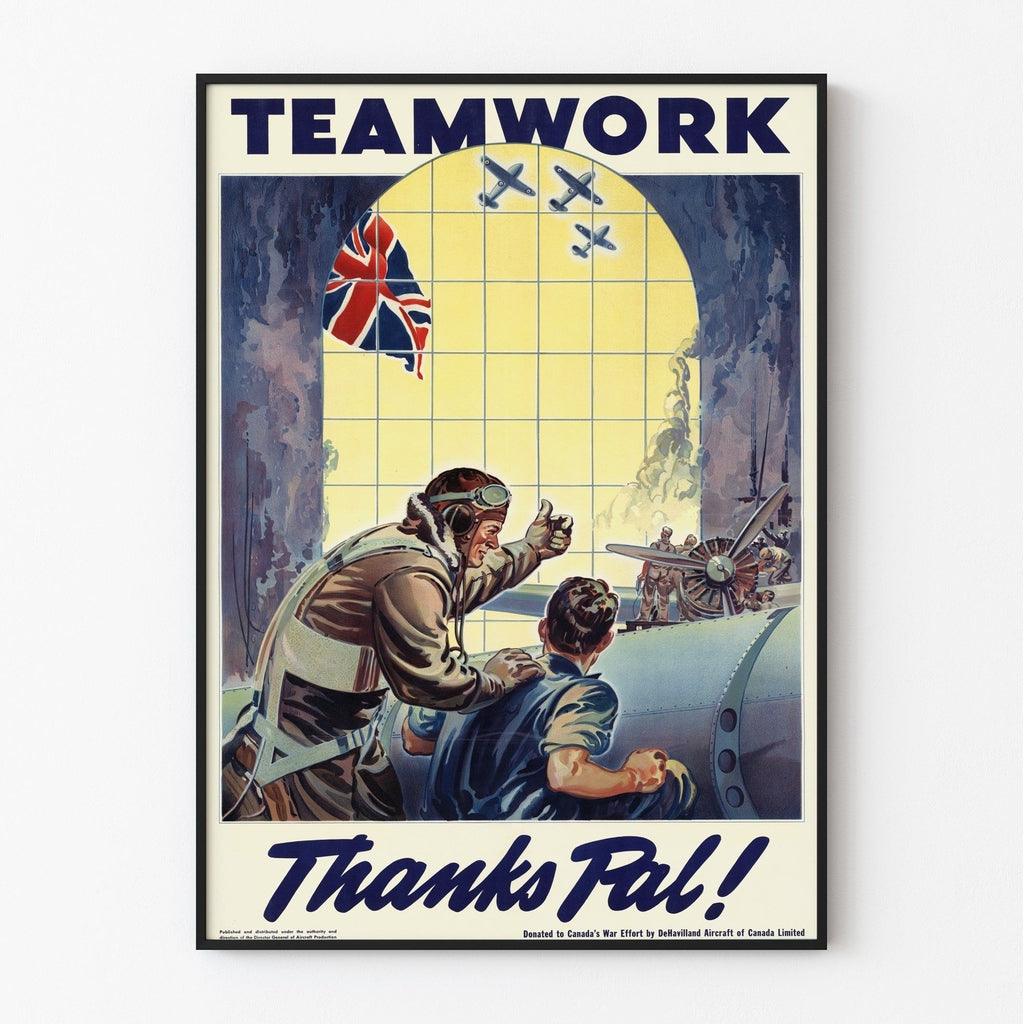 L'affiche Teamwork – Thanks Pal! incarna lo spirito di collaborazione e gratitudine durante la Seconda Guerra Mondiale. Creata per rafforzare l'unità tra i lavoratori industriali e le forze armate, questa affissione mette in luce l'importanza del lavoro collettivo nello sforzo bellico. Ideale per gli appassionati di storia o per gli amanti del design rétro, questa stampa d'arte è un pezzo forte che arricchirà il tuo spazio.