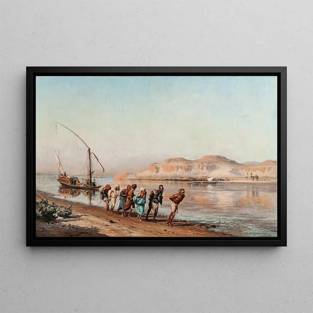 Dans "Remorquage sur le Nil", Frederick Arthur Bridgman nous plonge au cœur d'un paysage égyptien où la lumière dorée du soleil se reflète sur les eaux calmes du fleuve. La composition est soigneusement orchestrée, mêlant des teintes chaudes de sable et de terre à des nuances de bleu profond. Les voiles blanches des bateaux contrastent avec la richesse des couleurs environnantes, créant une atmosphère paisible et contemplative. Les détails minutieux des personnages et des embarcations témoignent de la maîtrise technique de l'artiste, invitant le spectateur à s'immerger dans cette scène de la vie quotidienne sur le Nil.