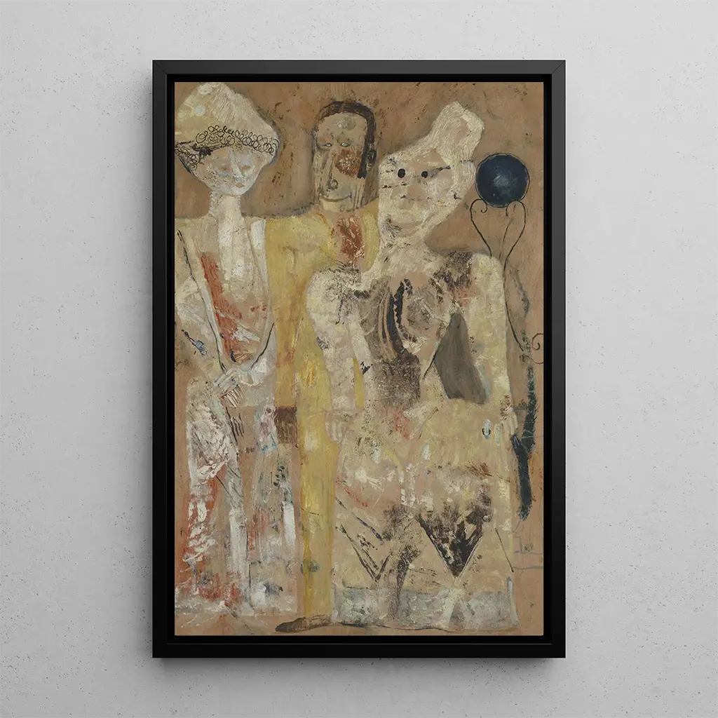 In "Tre personaggi", Frits van den Berghe ci immerge in un universo dove le emozioni si mescolano a una tavolozza di colori vibranti. La composizione, centrata su tre figure enigmatiche, evoca un'interazione sottile tra i personaggi, ognuno con un'espressione unica. Le tonalità calde e fredde si alternano, creando un'atmosfera allo stesso tempo dinamica e introspettiva. La tecnica dell'artista, che combina espressionismo e influenze surrealiste, invita lo spettatore a interrogarsi sulla natura delle relazioni umane e sui misteri dell'anima.