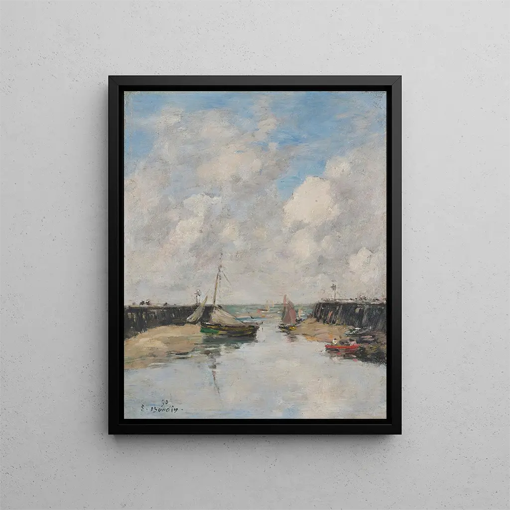 Lo stile di Boudin si distingue per la sua capacità di giocare con la luce e l'atmosfera. In "Trouville, le banchine", l'artista utilizza una palette delicata, oscillando tra le sfumature di blu e di sabbia, per evocare i riflessi mutevoli del mare e del cielo. La tecnica impressionista di Boudin si manifesta con tocchi di colore accostati, creando una texture vibrante che dà vita alla tela. I dettagli, sebbene presenti, sono spesso suggeriti piuttosto che definiti, permettendo allo sguardo di vagare e interpretare la scena a modo suo. Questo approccio unico invita a una contemplazione rilassante, dove si può quasi sentire il sussurro delle onde e il riso dei bambini che giocano sulla spiaggia. La composizione equilibrata, con le sue linee di banchine che si estendono verso l'orizzonte, guida lo sguardo dello spettatore, trascinandolo in un viaggio visivo oltre la tela.