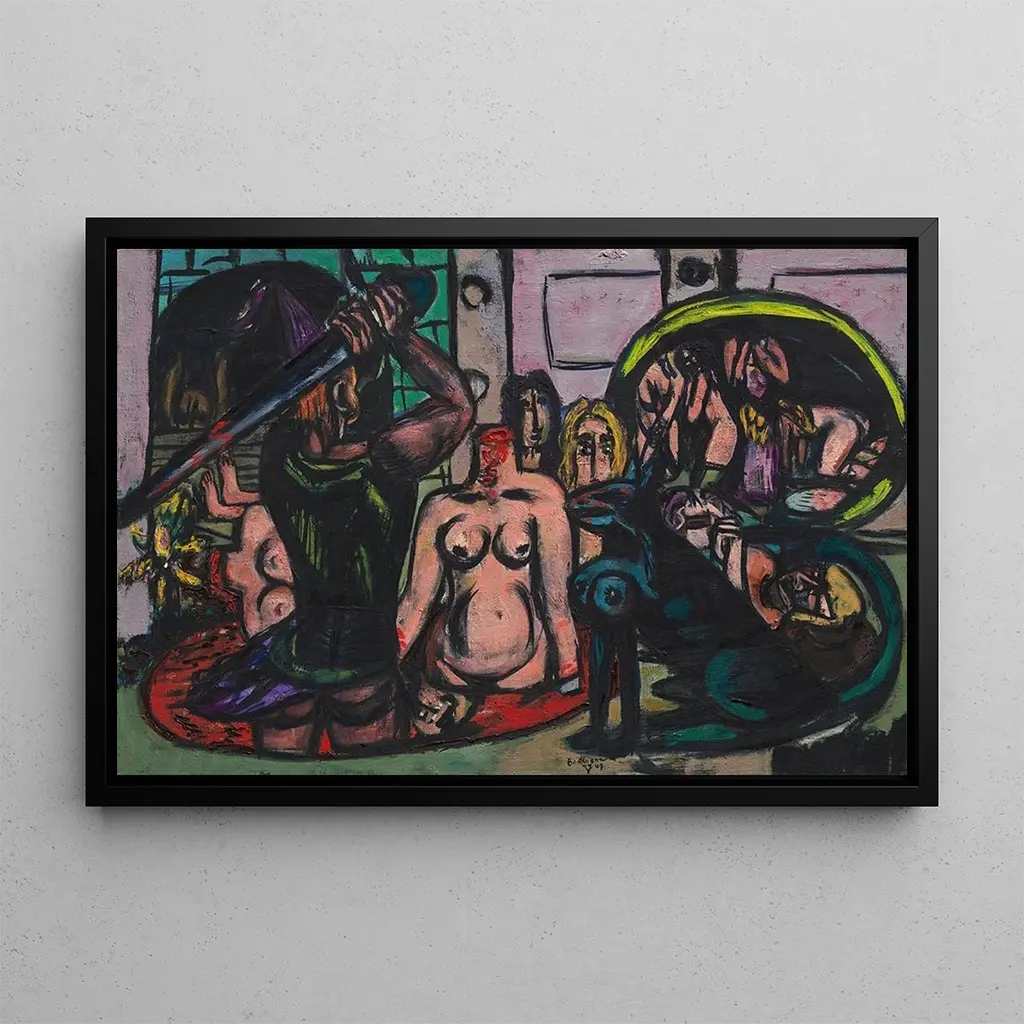 La riproduzione di Ultimo dovere di Perseo di Max Beckmann ci trasporta in un universo carico di emozione e simbolismo. Quest'opera, con i suoi colori vivaci e le sue forme espressive, illustra il momento tragico in cui Perseo si prepara a compiere il suo destino. La composizione complessa, mescolando figure umane ed elementi mitologici, crea un'atmosfera allo stesso tempo cupa e affascinante. Beckmann, con il suo stile unico, riesce a trasmettere la tensione drammatica della scena, invitando lo spettatore a percepire il peso del destino che grava sul eroe.