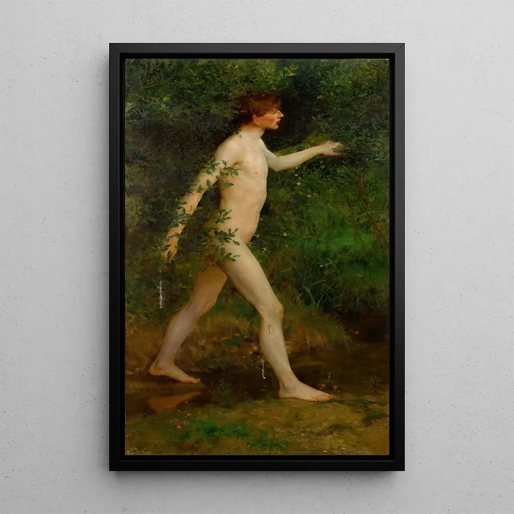 In questa opera coinvolgente, Henry Scott Tuke ci immerge nel cuore di una scena bucolica dove un giovane bagnante si rilassa in un ambiente verdeggiante. La luce soffusa filtra attraverso le foglie, creando giochi di ombra e luce che valorizzano le tonalità calde della pelle del modello. La tecnica della pittura ad olio, padroneggiata da Tuke, conferisce a questa tela un'atmosfera tranquilla e intima, invitando lo spettatore a immaginarsi in questo momento di serenità. Le sfumature di verde e blu evocano la freschezza della natura, mentre la postura rilassata del bagnante suggerisce un'armonia perfetta tra l'uomo e il suo ambiente.