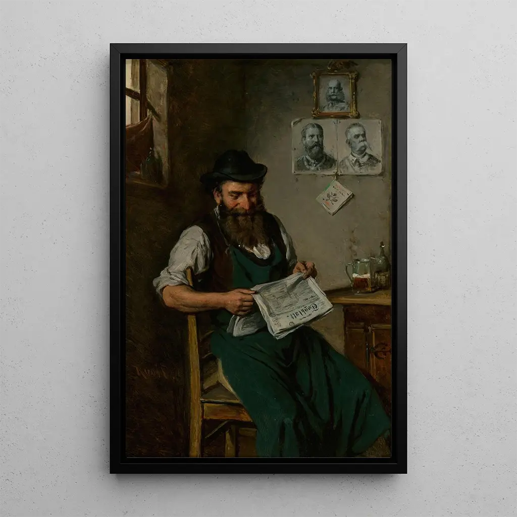 In "Un commerciante che legge un giornale", Hermann Kern dipinge una scena intima in cui il protagonista, assorto nella lettura, sembra sospeso nel tempo. I colori caldi e terrosi dominano la composizione, creando un'atmosfera accogliente e familiare. La luce soffusa che illumina il volto del commerciante mette in risalto i dettagli della sua espressione, rivelando una profondità emotiva. La tecnica di Kern, mescolando realismo e tocchi impressionisti, invita lo spettatore a riflettere sui pensieri di quest'uomo, celebrando al contempo la semplicità dei momenti quotidiani.