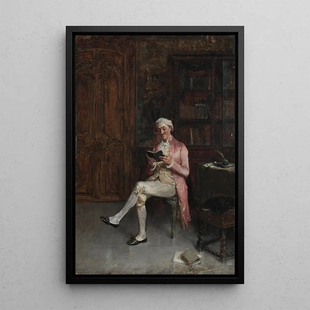 In questa riproduzione di Un philosophe, Walter Gay cattura l'essenza della contemplazione intellettuale. La tela, immersa in tonalità calde di marrone e oro, evoca un'atmosfera di serenità e profondità. Il personaggio centrale, immerso nei suoi pensieri, è circondato da oggetti simbolici che rafforzano l'idea della ricerca della conoscenza. La tecnica di Gay, combinando realismo e tocchi impressionisti, crea un gioco di luci sottile che cattura lo sguardo e invita alla riflessione. Ogni dettaglio, dalle pieghe del vestito del filosofo alle ombre proiettate sul muro, contribuisce a un'atmosfera immersiva e poetica.