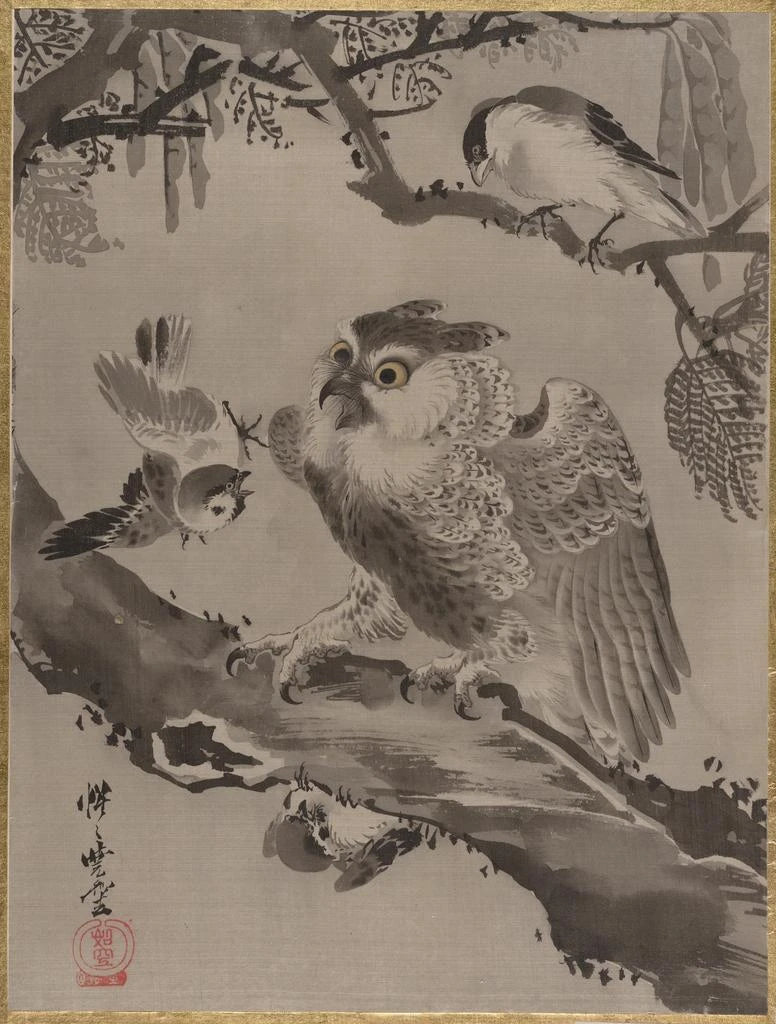 Un gufo deriso da piccoli uccelli - Kawanabe Kyōsai