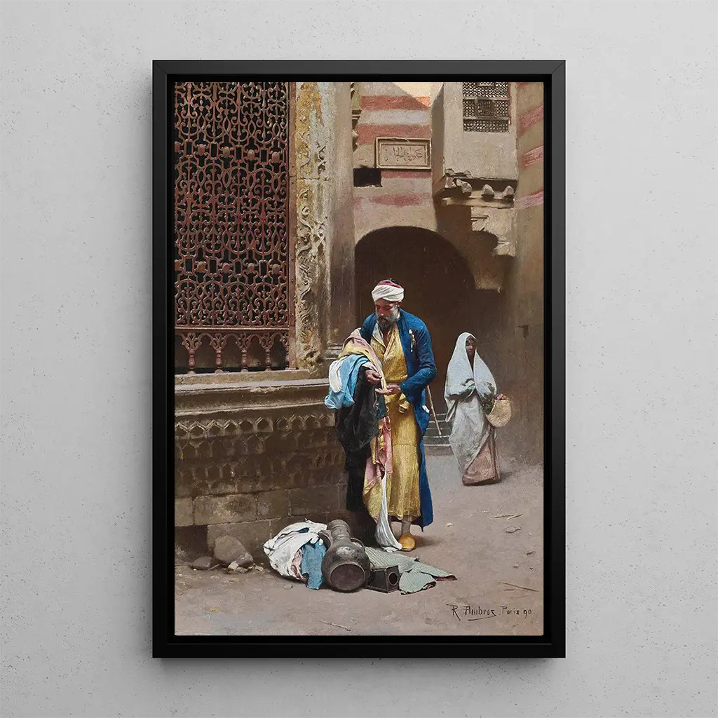 In questa stampa d'arte di Un marchand du Caire, l'artista Raphael von Ambros ci immerge nel cuore di una scena animata, dove i colori vivaci e i dettagli minuziosi catturano l'essenza di un mercato orientale. I personaggi, vestiti con costumi tradizionali, interagiscono in un'atmosfera vivace, mentre le ombre e le luci giocano sulle texture dei tessuti e degli oggetti. La tecnica della pittura ad olio permette una ricchezza cromatica che dà vita a ogni elemento, rendendo questa tela allo stesso tempo affascinante e immersiva. L'opera invita a una contemplazione degli scambi culturali e delle tradizioni, offrendo uno sguardo affascinante sulla vita quotidiana al Cairo.