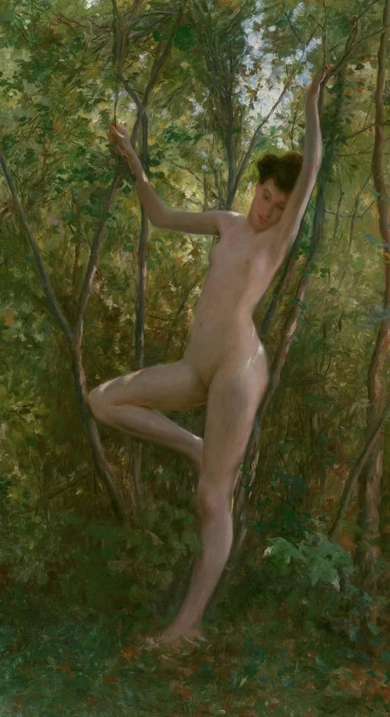 In "Una ninfa dei boschi", Julius LeBlanc Stewart ci immerge in un universo incantato dove la bellezza della natura si fonde con l'eleganza femminile. La composizione è dominata da tonalità di verde e marrone, evocando la foresta lussureggiante. La luce soffusa filtra attraverso le foglie, creando un'atmosfera serena e quasi mistica. La ninfa, vestita con un abito leggero, sembra danzare con le ombre e le luci, incarnando lo spirito della natura. La tecnica di Stewart, che combina realismo e impressionismo, dà vita a ogni dettaglio, dalle foglie delicate ai riflessi sulla pelle della figura centrale, invitando lo spettatore a una contemplazione prolungata.