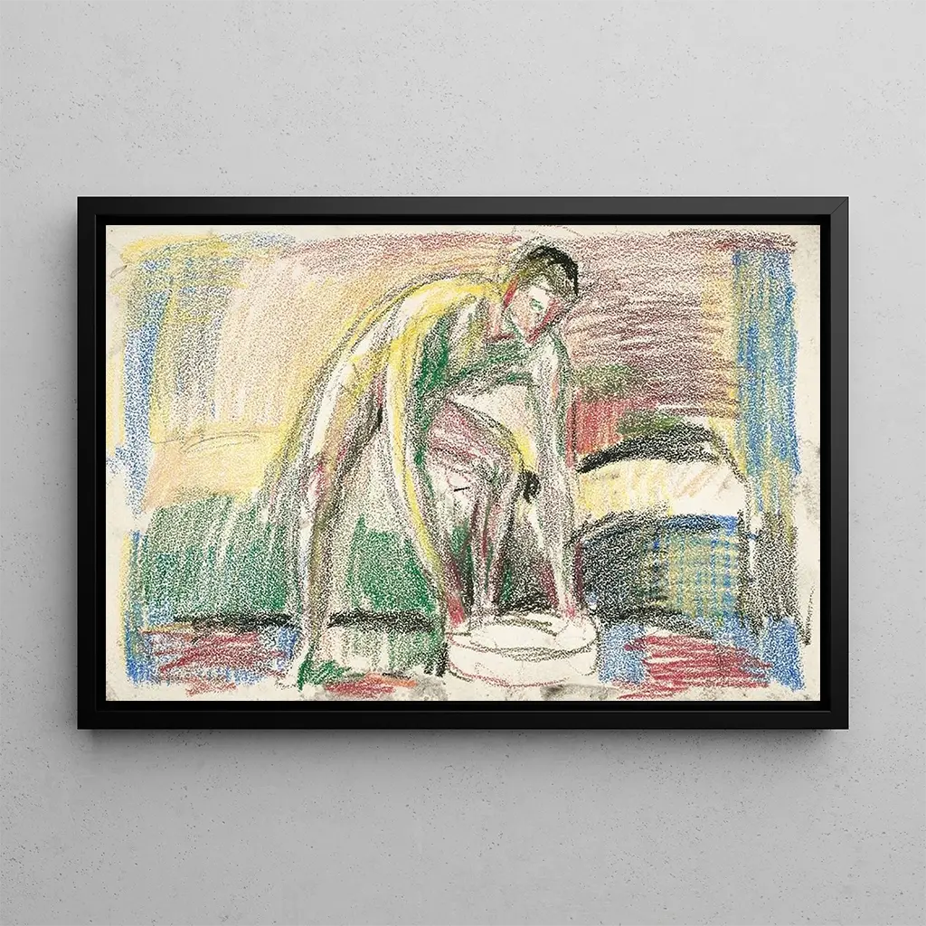 In "Uomo nudo che si lava i piedi", Edvard Munch ci immerge in una scena intima e toccante, dove la vulnerabilità umana è messa in evidenza. La composizione, centrata sulla figura maschile, è accentuata da colori scuri e contrasti sorprendenti che creano un'atmosfera al tempo stesso inquietante e affascinante. La tecnica di Munch, caratterizzata da pennellate espressive, dà vita all'emozione grezza che emana da questa stampa d'arte, invitando lo spettatore a riflettere sulla condizione umana e sulla solitudine.