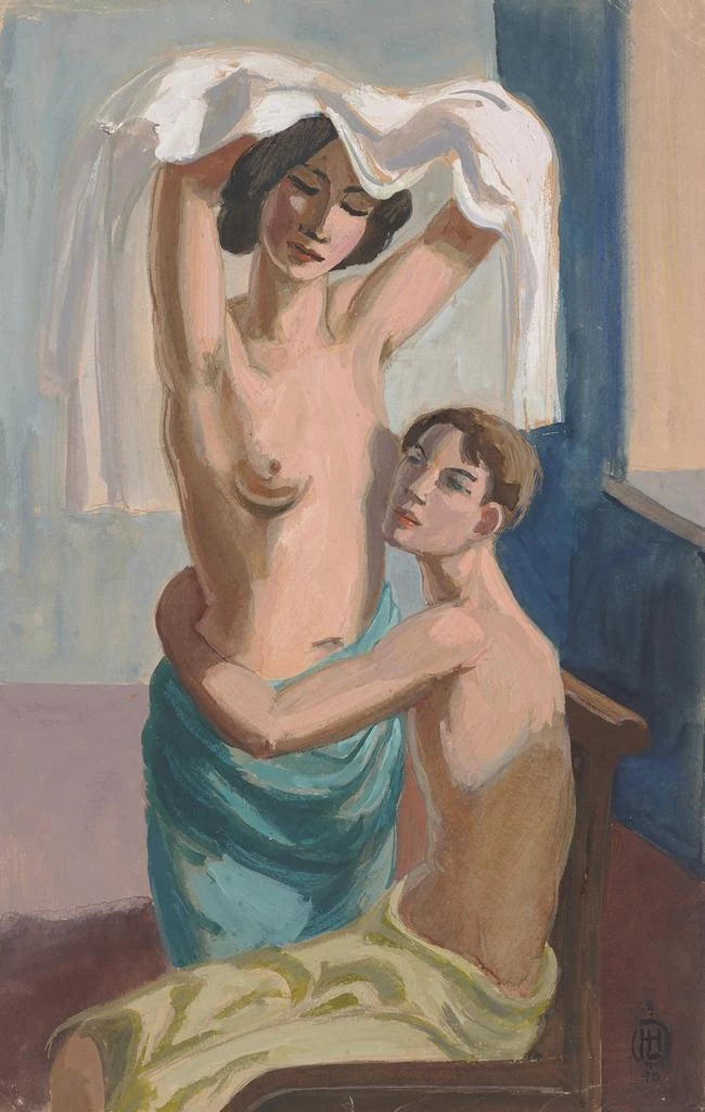 Stampa d'arte | Uomo nudo seduto che abbraccia una donna nuda in piedi - Hermann Lismann