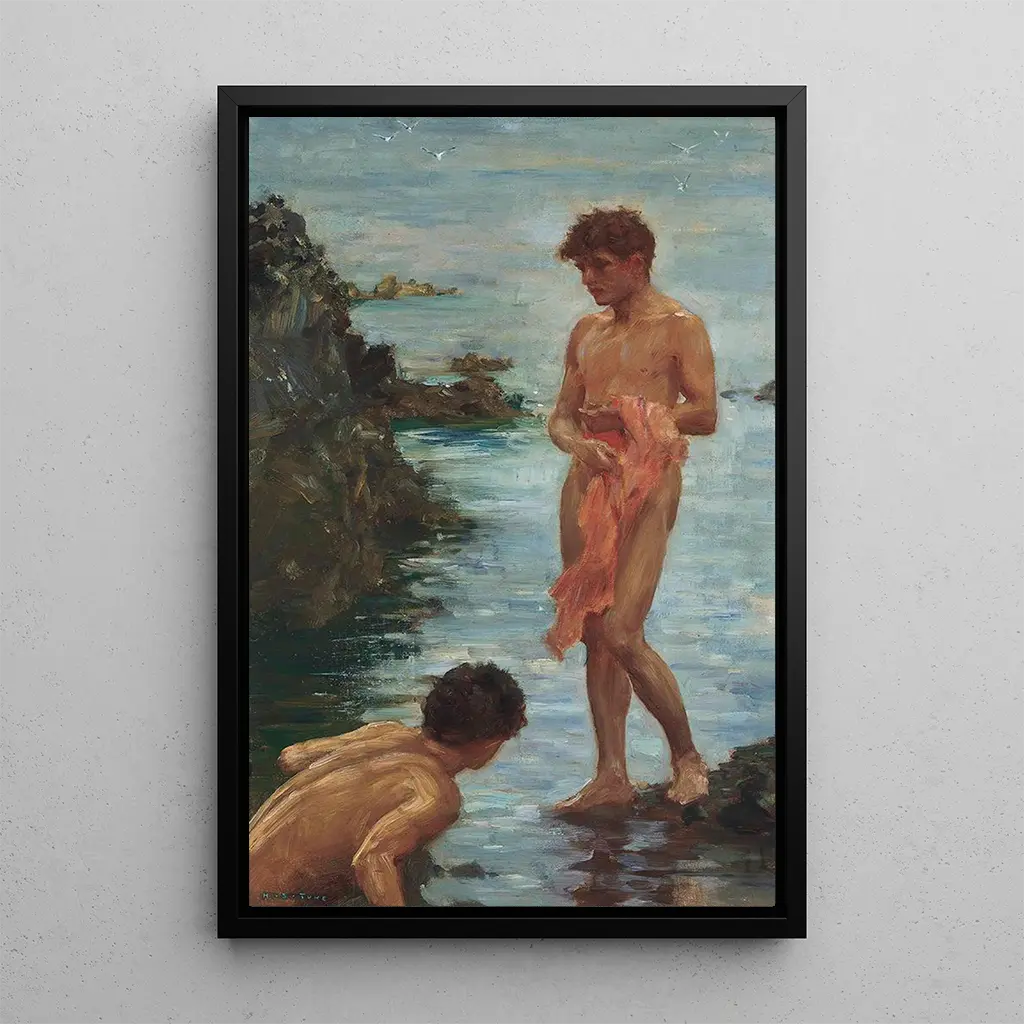Henry Scott Tuke, pittore britannico attivo alla fine del XIX secolo e all'inizio del XX, è riconosciuto per le sue rappresentazioni della vita costiera e dei giovani uomini all'aperto. Influenzato dall'impressionismo e dal movimento prerafaellita, Tuke ha saputo catturare la bellezza della natura e la sensualità dei suoi modelli. Le sue opere, spesso ispirate dalla regione della Cornovaglia, testimoniano un'epoca in cui arte e vita quotidiana si intrecciavano. Esplorando temi di giovinezza, libertà e bellezza naturale, Tuke ha lasciato un'eredità duratura nel mondo dell'arte, celebrando la gioia semplice dell'esistenza.