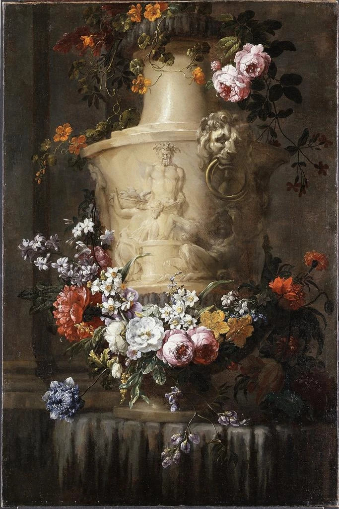 Quadro Vase in marmo con ghirlanda di fiori - Jean-Baptiste Monnoyer | Stampa d'arte