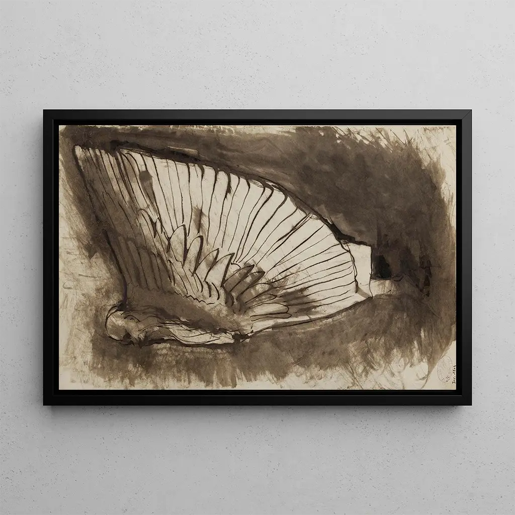 In questa stampa d'arte di Vieil homme l'habit d'oiseau, Victor Hugo ci immerge in una scena intrisa di poesia e malinconia. La tela, ricca di colori scuri e sfumature di grigio, raffigura un vecchio vestito con un abito che ricorda le piume di un uccello, simbolo sia della libertà che della vulnerabilità. La tecnica di Hugo, che combina acquerello e inchiostro, crea un'atmosfera eterea, quasi onirica, dove lo sguardo del vecchio sembra interrogare il mondo che lo circonda. Quest'opera, allo stesso tempo semplice e profonda, invita a una riflessione sul passare del tempo e sulla solitudine.