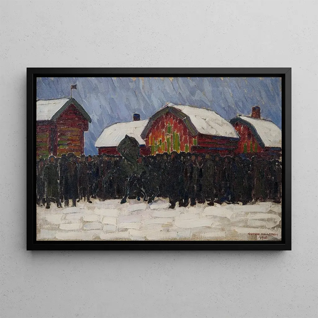 La riproduzione del quadro "Vendita di cavalli" di Gunnar Hallström evoca una scena vibrante e animata, dove l'energia dei cavalli e degli acquirenti si mescola in un contesto rurale. I colori vivaci e i dettagli minuziosi degli animali catturano l'essenza stessa della transazione, rendendo palpabile l'emozione del momento. Hallström, con la sua maestria nei giochi di luce e ombra, riesce a creare un'atmosfera vivace, dove ogni personaggio sembra prendere vita. L'opera invita a contemplare non solo la bellezza dei cavalli, ma anche l'importanza dell'allevamento e del commercio nella società del suo tempo.