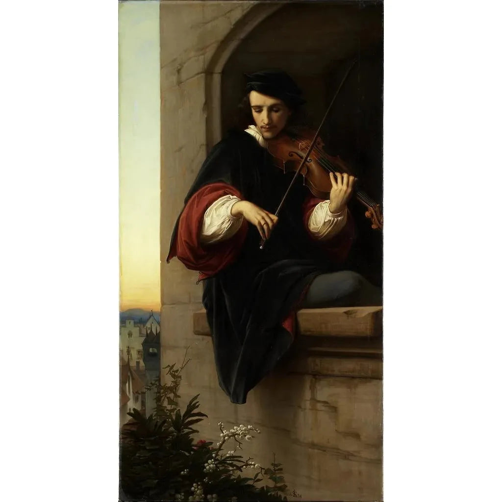 In "Violinista alla finestra del campanile", Eduard von Steinle ci trasporta in un momento di serenità e contemplazione. La stampa d'arte rappresenta un musicista, perso nella sua musica, che suona con passione alla finestra di un campanile. I colori delicati e i giochi di luce creano un'atmosfera intima, quasi magica, dove il suono sembra risuonare oltre la tela. La composizione, con il suo equilibrio armonioso tra interno ed esterno, invita lo spettatore a immaginarsi in questo istante sospeso, dove musica e arte si incontrano.