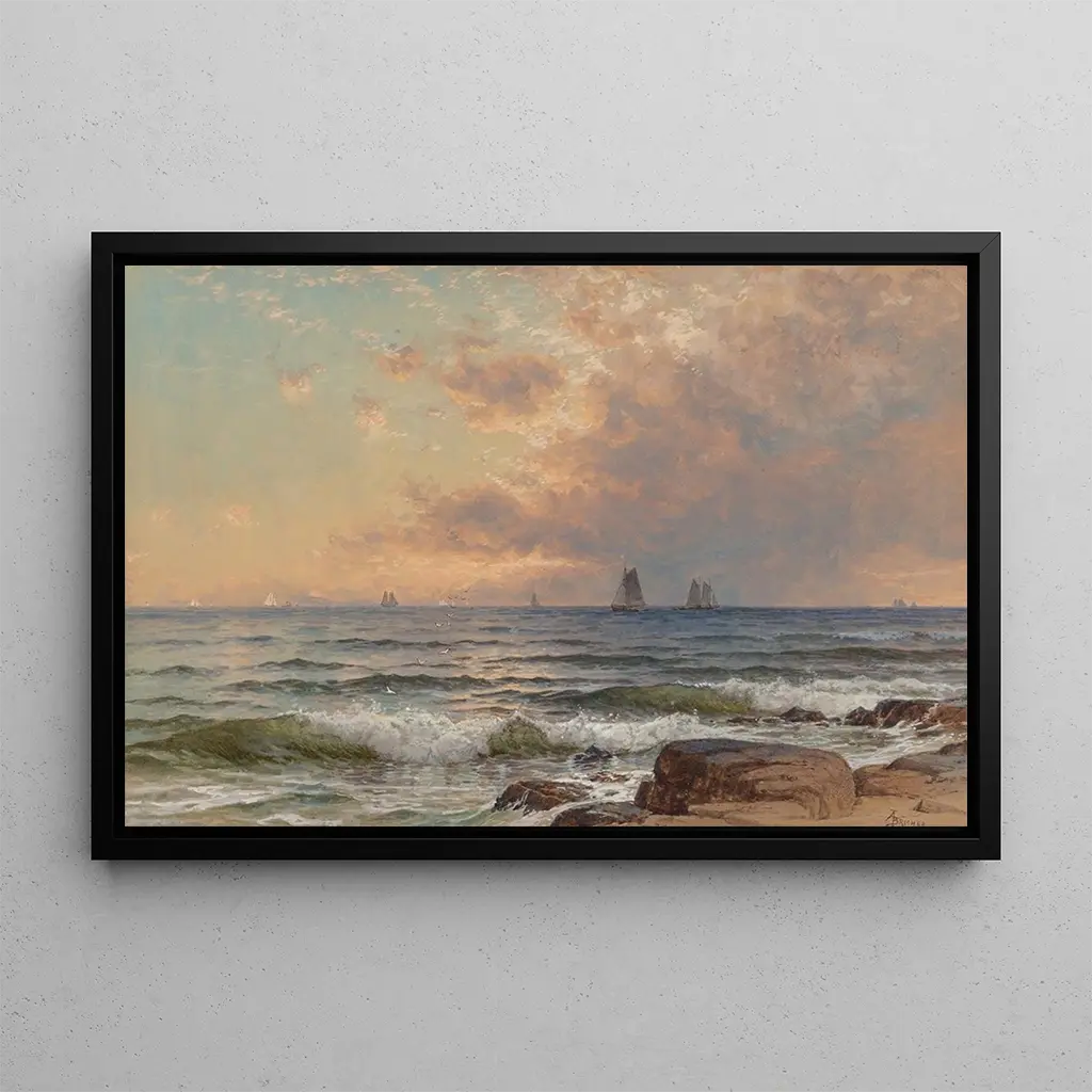 Voiles au coucher du soleil : une harmonie entre ciel et mer Dans cette œuvre captivante, Alfred Thompson Bricher nous transporte au bord de l'eau, où les voiles blanches des bateaux se dessinent sur un fond de coucher de soleil flamboyant. Les nuances de rose, d'orange et de violet se mêlent avec délicatesse, créant une atmosphère paisible et rêveuse. La technique de Bricher, qui allie réalisme et impressionnisme, permet de ressentir la brise légère et le murmure des vagues. Chaque coup de pinceau semble capturer la magie d'un instant éphémère, invitant le spectateur à s'immerger dans cette scène maritime envoûtante. Alfred Thompson Bricher : un maître du paysage américain Né en 1837, Alfred Thompson Bricher est une figure emblématique du mouvement paysagiste américain du XIXe siècle. Influencé par les grands maîtres européens, il développe un style unique qui célèbre la beauté naturelle des côtes américaines. Bricher est reconnu pour sa capacité à jouer avec la lumière et l'atmosphère, ce qui lui permet de créer des œuvres d'une grande profondeur émotionnelle. Son travail, souvent associé à l'école de l'Hudson River, témoigne de l'importance de la nature dans l'art de son époque, tout en préfigurant les tendances impressionnistes qui émergeront plus tard. Une acquisition décorative aux multiples atouts La reproduction de Voiles au coucher du soleil est une pièce décorative idéale pour apporter une touche de sérénité à votre intérieur. Que ce soit dans un salon, un bureau ou une chambre, ce tableau évoque une ambiance apaisante et inspirante. Sa qualité de reproduction garantit une fidélité remarquable aux couleurs et aux détails de l'œuvre originale, tout en offrant un attrait esthétique indéniable. En choisissant cette toile, vous faites le choix d'une décoration qui allie élégance et émotion, transformant votre espace en un havre de paix.